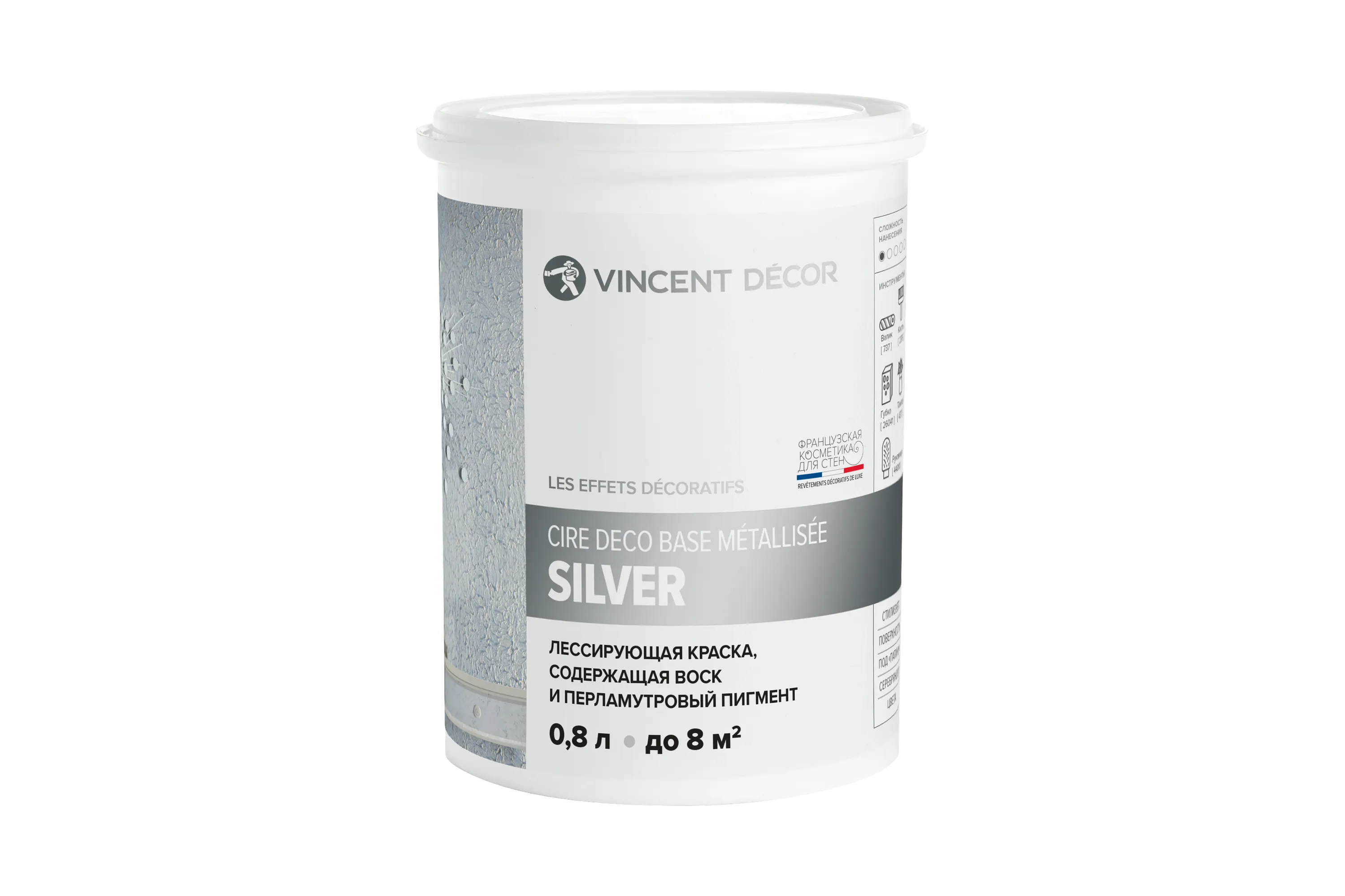 Покрытие с эффектной текстурой и благородным металлизированным блеском. Эффект создаёт на стенах сложную поверхность с мягкими переливами и тонкими серебристыми акцентами, напоминающими старинные отделочные техники. Влагостойкое покрытие эффективно маскирует мелкие дефекты основания и создаёт ощущение классической роскоши.